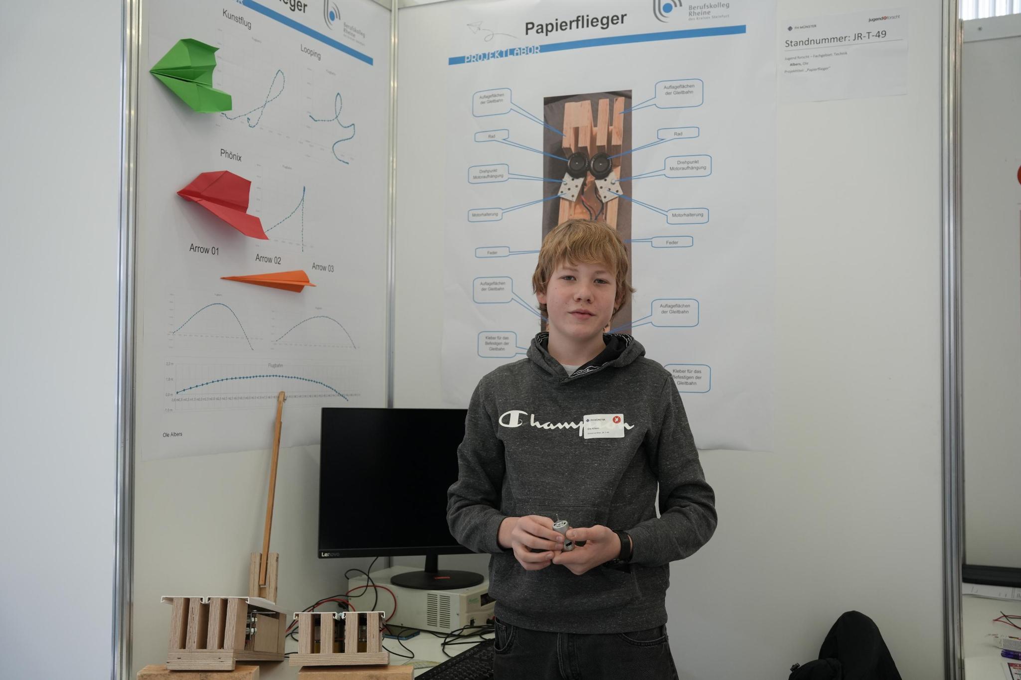 Beim Regionalwettbewerb Münsterland von Jugend forscht in Rheine, der Ende Februar 2026 stattfand, konnte Ole Albers mit seinem Projekt “Papierflieger” der ersten Platz in seiner Kategorie gewinnen. Hierbei untersuchte er die Flugeigenschaften und klassifizierte sie. Dafür baute er auch – nach zahlreichen Recherchen und Versuchen – eine Startvorrichtung , damit diese immer unter möglichst gleichen Bedingungen starten konnten. Eigenschaften, die hinzugezogen wurden, waren: Geradeaus, Looping, Bumerang, Geschwindigkeit und Flugweite. Betreut wurde er hierbei vom Projektlabor “artandtech.space”.